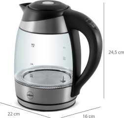 A vízforraló 1,8 l űrtartalmú, a minimális forralási mennyiség 0,5 l, a fedett fűtőtalp pedig megkönnyíti a tisztítást. Az üvegedény LED világítással, a 360°-os forgó talp, a kivehető szűrő és a vízszintjelző nap mint nap nagyobb kényelmet biztosít. A hármas védelem a túlmelegedés, a túlfeszültség és a víz nélküli működés ellen biztonságos üzemet garantál.