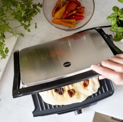 Univerzális elektromos grill mindennapi használatra: érintkezős és sík grill egyben, 2000 W teljesítmény, tapadásmentes lapok, fokozatmentes hőmérséklet-szabályozás és praktikus zsírlevezetés. A 180°-os nyitásnak köszönhetően nagy grillező felületet kap, nem hiányzik a rozsdamentes kivitel, a nem melegedő fogantyú és a üzemjelzők az egyszerű használatért.