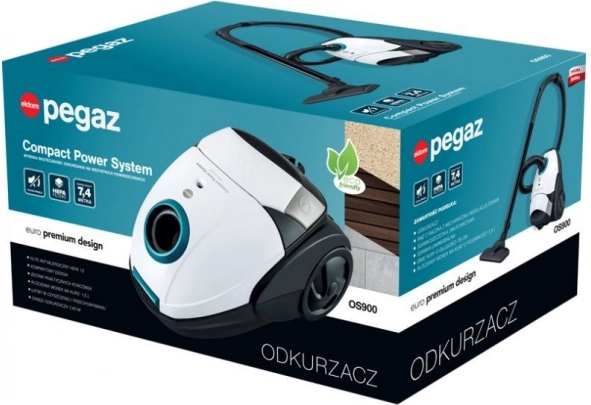 A kompakt, porzsákos ELDOM Pegaz porszívó 700 W teljesítményt, HEPA H13 szűrőt az allergiások számára és 7,4 m munkahatótávolságot kínál. Kicsi és könnyen tárolható, automatikus kábelvisszacsévéléssel, függőleges és vízszintes parkolási lehetőséggel, valamint 1,5 l-es textil porzsákkal és eldobható zsákokkal használható.