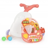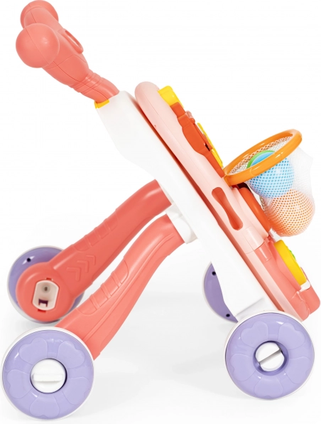 Használható járássegítőként, amely segít a gyermeknek megtanulni megtenni az első lépéseket. A fogantyú (kétfokozatú beállítás) révén a gyermek biztos támaszt kap, a szélesen elhelyezett kerekek pedig megfelelő stabilitást nyújtanak. A kerekeken lévő további gumírozás védi a padlót a karcolásoktól, és megakadályozza a megcsúszást, így a járássegítő mindig a kívánt irányba halad.