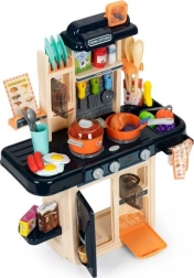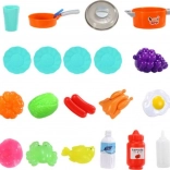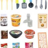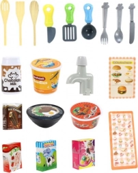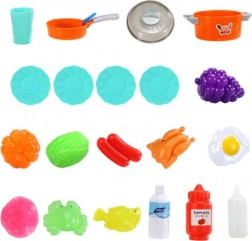 A gazdag, 42 elemből álló készlet tartalmaz fedeles lábost, serpenyőt, eszközöket, tányérokat, bögrét, gyümölcsöket és zöldségeket, halat, csirkét, rákot, tojást, „tejet”, „ketchupot”, fagylaltos dobozokat és még sok mást. Minden minőségi műanyagból és kartonból készült, éles élek nélkül a biztonságos játékért. A konyha támogatja a szerepjátékot, és segít elsajátítani a főzés és a rend alapjait.