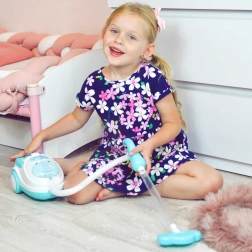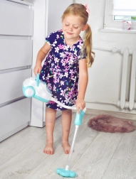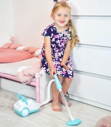 Ez a kék-fehér gyerek porszívó hűen utánozza a valódi készüléket – bekapcsolás után világít, valósághű hangokat ad, és a szívófunkció segítségével a mellékelt polisztirol golyócskákat is fel tudja szippantani. Remek szerepjátékhoz, fejleszti a felelősségtudatot, és játékos módon tanítja a gyerekeket a rendre.
