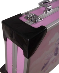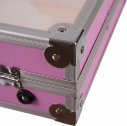 A rózsaszín bőrönd fém élvédőkkel, sarkokkal és zárakkal rendet tart és megóvja az eszközöket otthoni és utazás közbeni használatkor is.