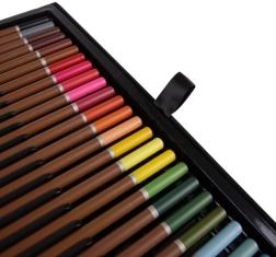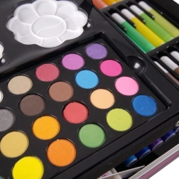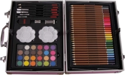 A készlet tartalma különféle technikákhoz lett összeállítva – a finom skicceléstől a határozott filcvonalakon át a fedő akrilfestésig vagy a könnyed akvarell átmenetekig. A fémmerevítésekkel és zárakkal ellátott masszív bőröndnek köszönhetően a szállítás biztonságos és kényelmes, legyen szó otthonról, iskoláról vagy utazásról.