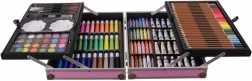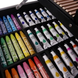 28× színes ceruza, 33× filctoll, 24× olajpasztell, 24× akvarellfesték, 24× akrilfesték, 2× radír, 2× paletta, 2× ceruza, 4× ecset, 1× hegyező, 1× bőrönd