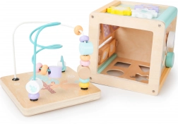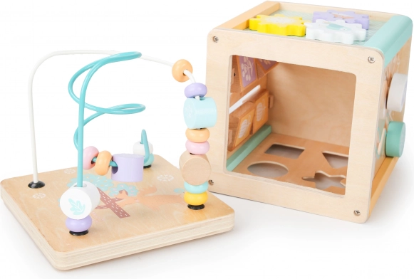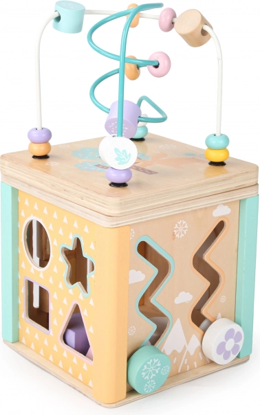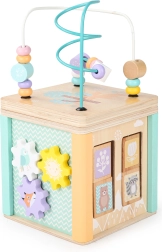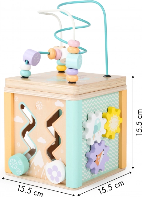 A kocka minden oldala eltérő játékelemeket kínál, mint például útvesztő, tolható kirakók vagy forgó fogaskerekek, amelyek támogatják a gyermek motoros és kognitív készségeit.