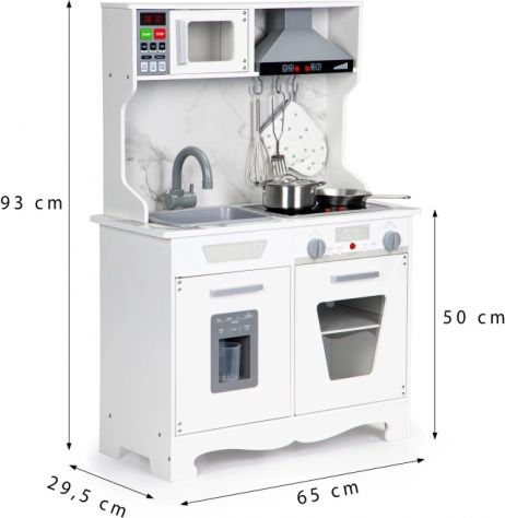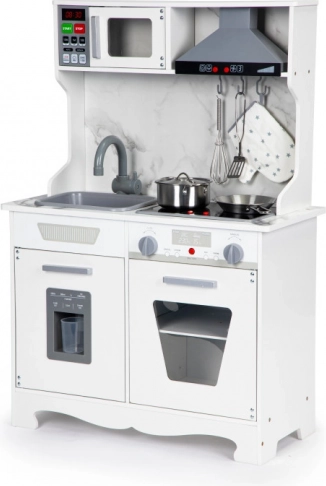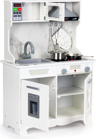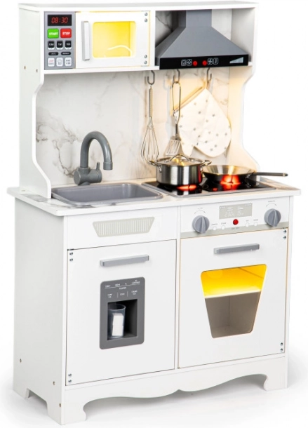 Ez a fa konyha ECOTOYS tökéletes a kis szakácsok számára, és valósághű élményt nyújt a fény- és hanghatásoknak köszönhetően. Nyitható szekrényekkel, csappal ellátott mosogatóval és fém kiegészítőkkel van felszerelve.