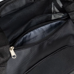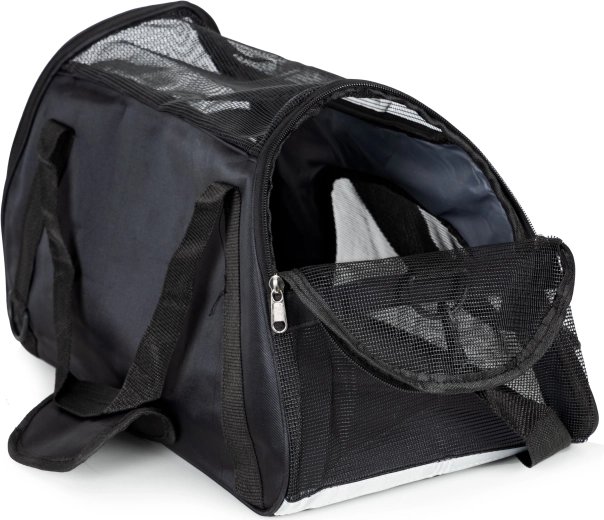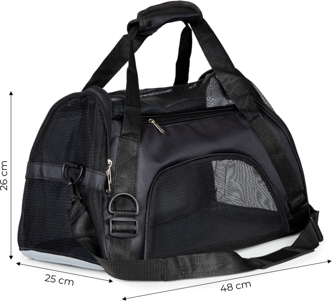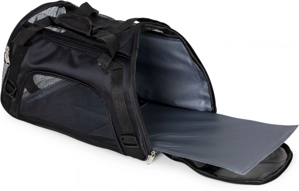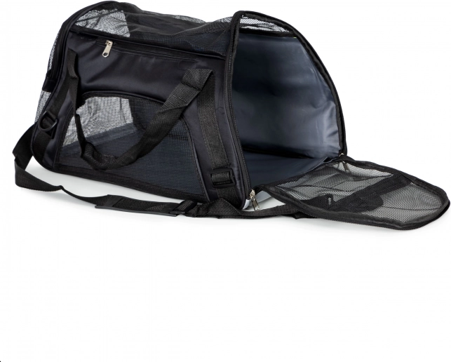 Biztonságos cipzár mindkét oldalán könnyű hozzáférést és a két oldalról való nyitás lehetőségét kínálja. A táska zsebbel van ellátva minden fontos kelléket, mint a játékok vagy az állatok tápláléka, tárolására.