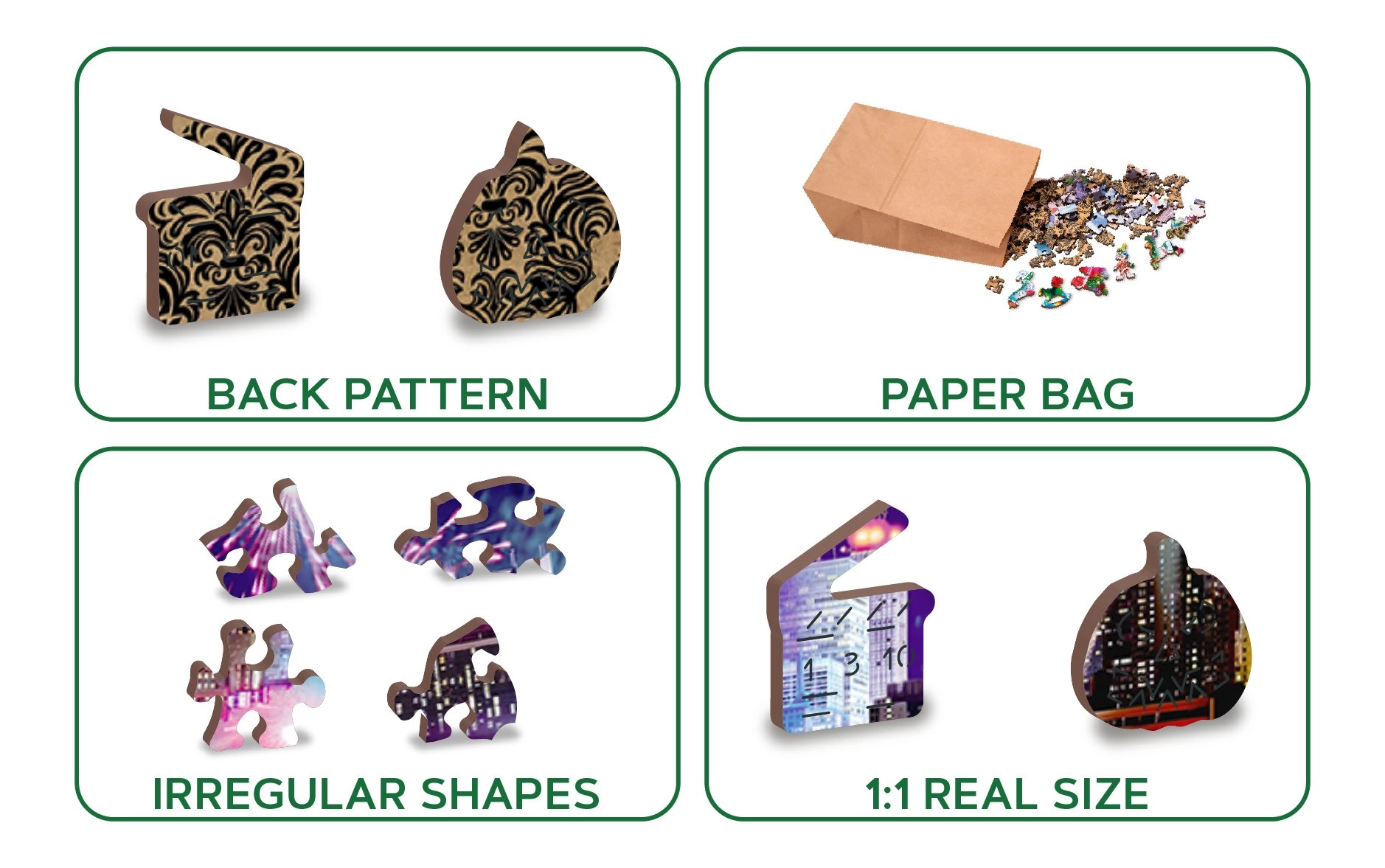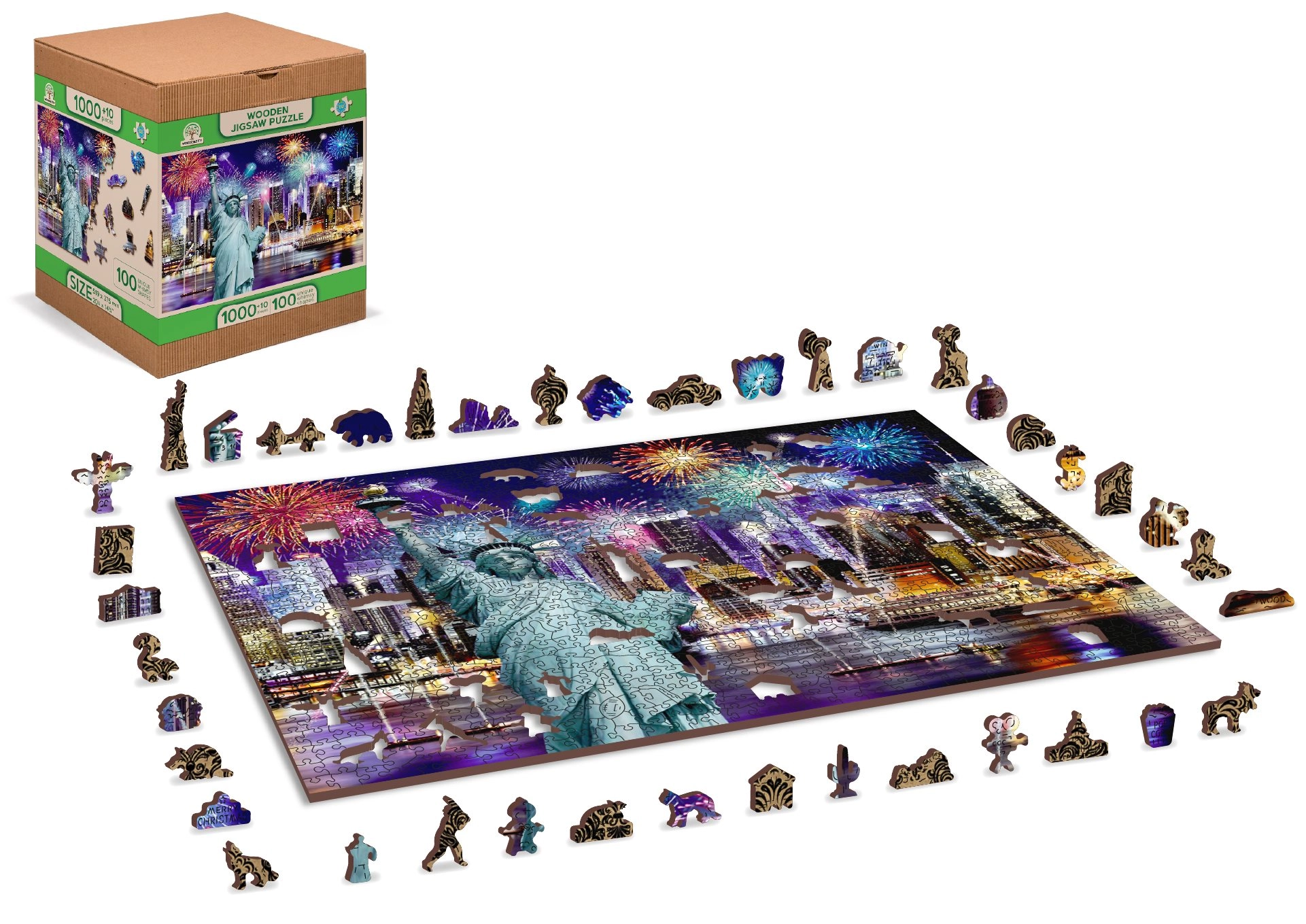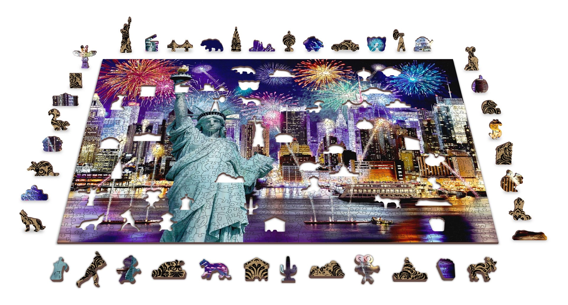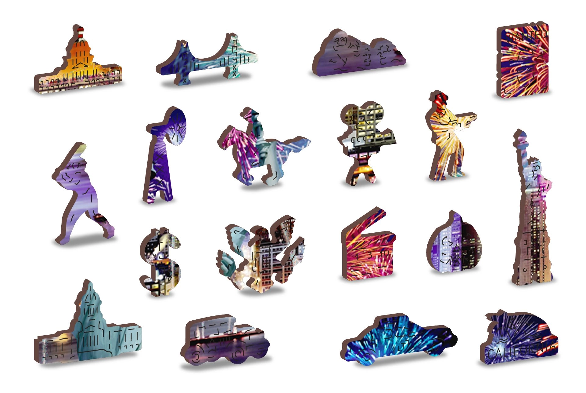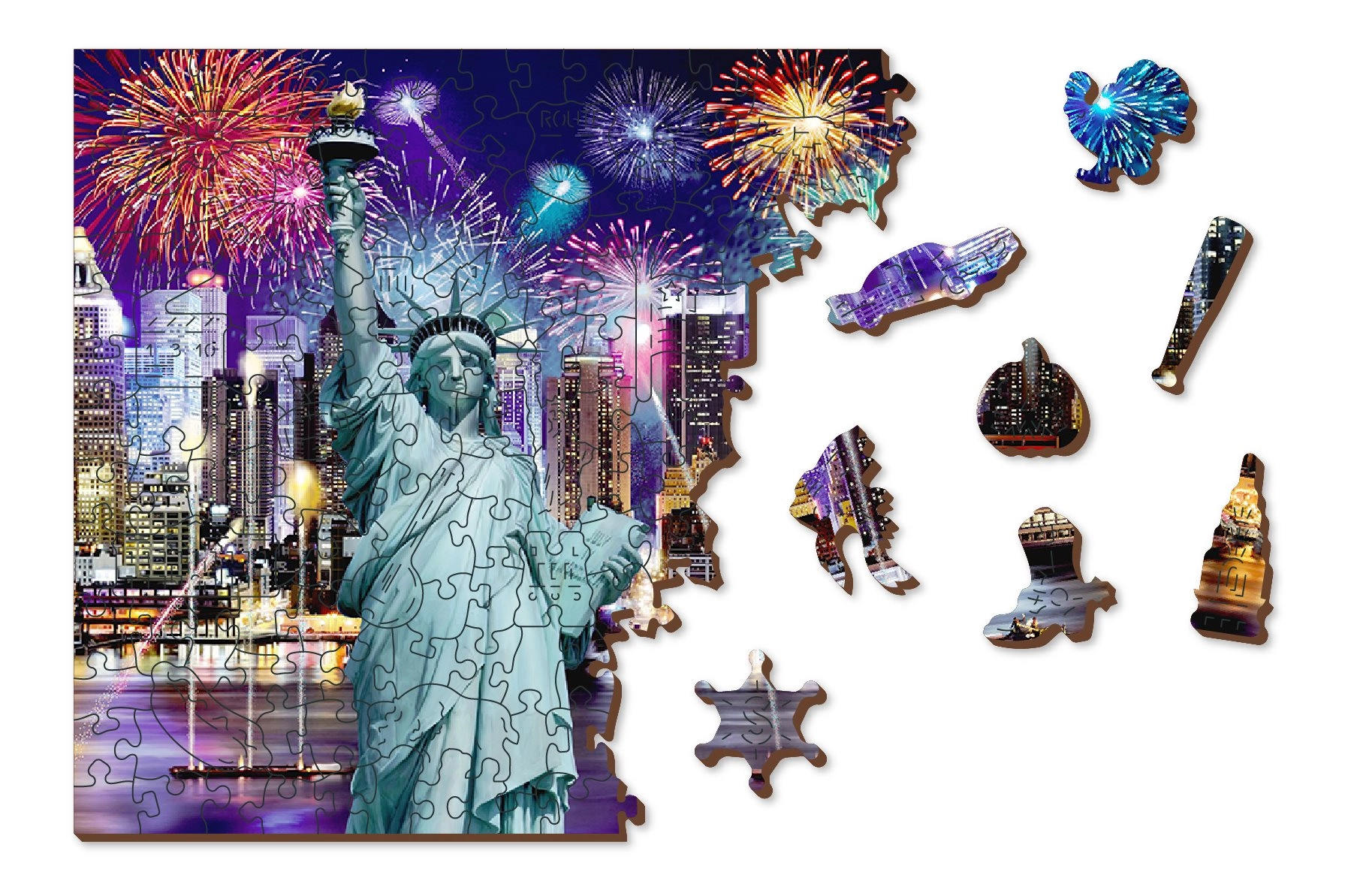Térj be az Éjszakai New York világába a mi luxus 2 az 1-ben fa puzzle-nkkal. Gondosan faragott precíz anyagból, ez a puzzle egyedi formájú darabokat kínál, amelyek különállóan állatokat, tárgyakat vagy épületeket alkotnak, miközben környezetbarát marad.