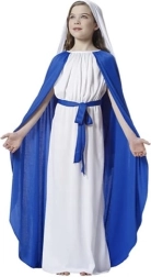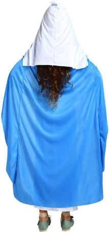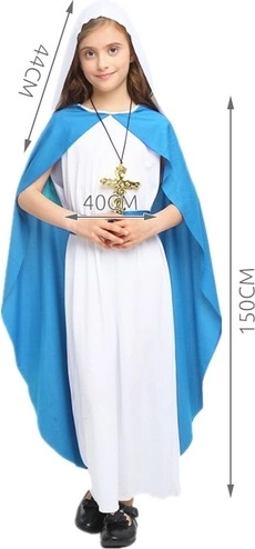 Ez a hagyományos Mária-kosztüm hosszú fehér ruhából kék köpenynyel áll, amely visszafogottan és hatásosan fejezi ki a szereplő szerénységét és odaadását. A könnyű, puha poliészternek köszönhetően a gyerekek számára kényelmes viselet, nem szorít, és szabad mozgást biztosít az előadás és a játék közben.