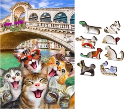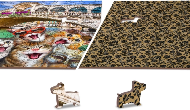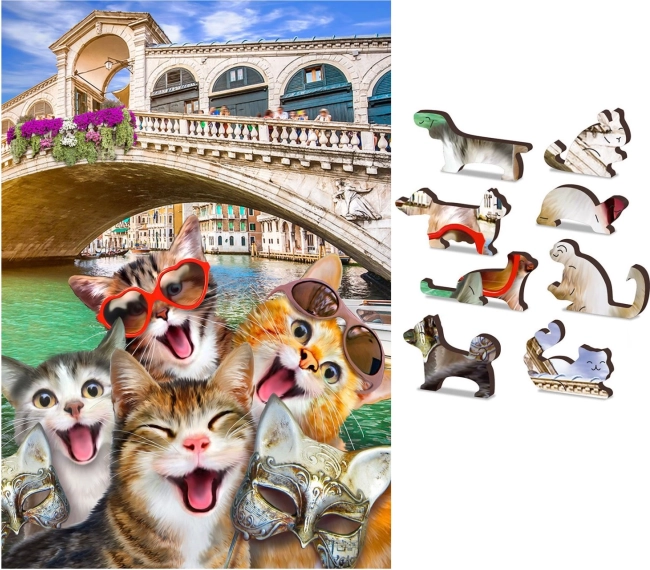 Fa puzzle Cicák Velencében 2 az 1-ben innovatív megközelítést hoz a klasszikus kirakókhoz az egyedien formázott darabjaival. Az ismert épületek, állatok vagy tárgyak alakú darabok minden kirakáshoz új kalanddimenziót adnak. Ráadásul, a lézerrel kiemelt részletek miatt ezek a darabok apró figurákként is szolgálhatnak.