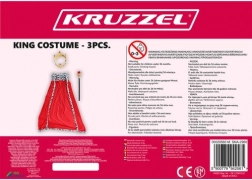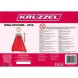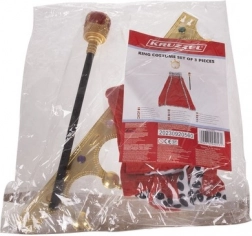 Ez a komplett szett pillanatok alatt elbűvölő királlyá varázsolja gyermekét. A puha textilből készült köpeny mélypiros színben fekete-fehér műszőrmével szegélyezett, és hosszú zsinórral köthető meg a kényelmes, biztos viselésért. A könnyű jogar piros „drágakővel” tekintélyt kölcsönöz a jelmeznek, a rugalmas arany korona színes kövekkel pedig teljessé teszi a királyi megjelenést.
