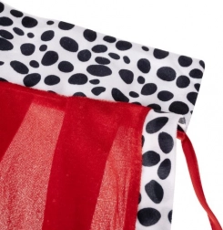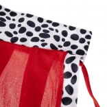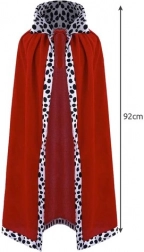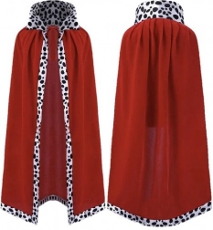 A piros köpeny fekete-fehér „dalmatás” szegéllyel fenséges hatást kelt, tapintása puha, és a megkötőnek köszönhetően jól tart a vállakon.