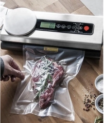 A digitális mérleg 2 kg-ig, 1 g-os lépésközzel segít a porciók lemérésében még a vákuumozás előtt – kevesebb pazarlás és jobb készletszervezés.