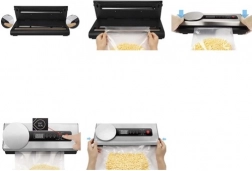 Az irányítás intuitív – elérhetők programok száraz/nedves élelmiszerekhez, lezáráshoz, sebességállításhoz, pácoláshoz és levegő kiszívásához csővel tasakokból és edényekből. A praktikus felszereltség tartalmaz dugót palackok vákuumozásához, fóliavágót és 9 fóliatekercset + 5 nagyobb tasakot, így a kicsomagolás után azonnal csomagolhat.