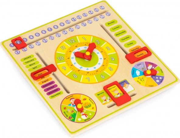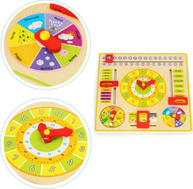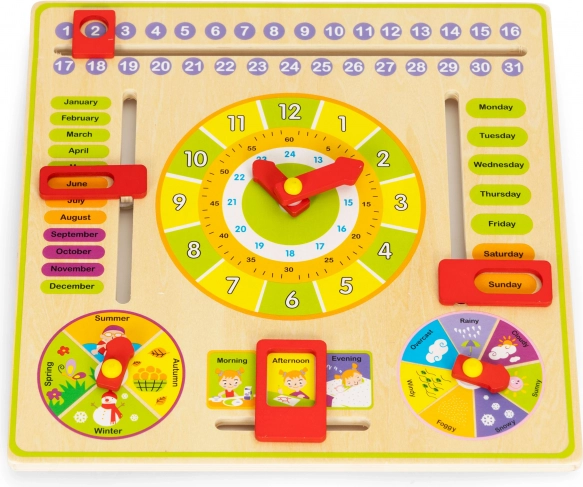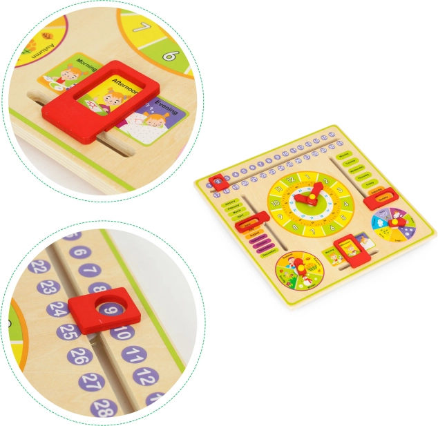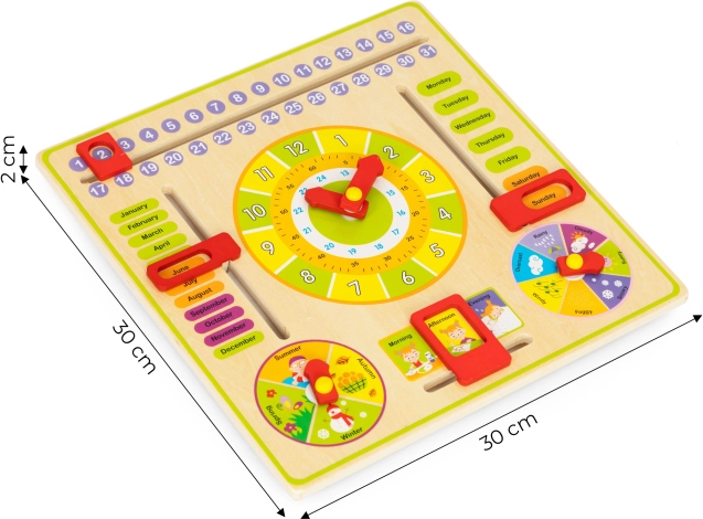 A tábla lehetőséget ad a gyerekeknek megtanulni a hét napjait, a hónapokat és az évszakokat, miközben segít helyesen olvasni az időt. Emellett fejleszti a kézügyességet és nem tartalmaz éles széleket, ami biztonságos a gyerekek számára.