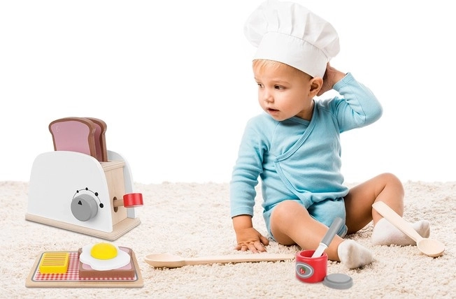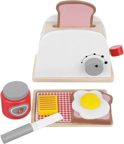 Fával készült játék kenyérpirító, amely kreatív és oktató játékélményt nyújt gyermekeknek. A szett színes és szórakoztató, ideális ajándék minden korosztály számára.