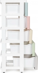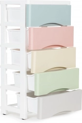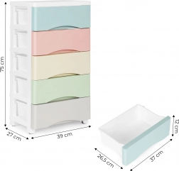 Ez a kompakt, kerekeken guruló komód áttekinthető tárolást kínál kozmetikumnak, játékoknak, irodaszereknek és apróságoknak az otthonban. Öt tágas, pasztellszínű fiók biztosít elegendő helyet, és integrált fogantyúknak köszönhetően könnyen kihúzható. A fehér váz letisztult hatást kelt, illik a modern enteriőrökhöz.