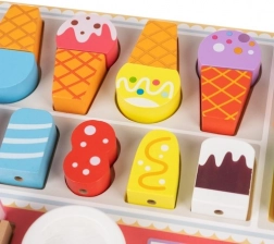 Tölcsérek, gombócok, jégkrémek, kis tálka, „csokoládé”, tálca és tábla – minden az önfeledt kombináláshoz és a formák, színek tanulásához.