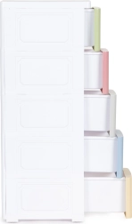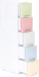 A biztonságos használatról a fiókzárak gondoskodnak, amelyek megakadályozzák a nem kívánt kihúzást – kiváló megoldás olyan terekbe, ahol gyerekek mozognak. Az ellenálló műanyag és a letisztult fehér keret pasztellszínű fiókokkal modern megjelenést kölcsönöz a belső térnek.