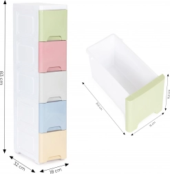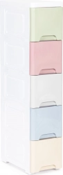 Ez a keskeny műanyag polcos szekrény öt kihúzható fiókkal okos és áttekinthető tárolást biztosít játékoknak, kozmetikumoknak és apróságoknak az otthonban. A görgőknek köszönhetően könnyedén oda tolhatja, ahol épp szükség van rá, a fiókok elején lévő profilozott fogantyúk pedig kényelmes nyitást biztosítanak.