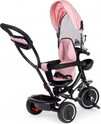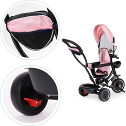 Az összecsukható napellenző véd a napsütéstől, míg az első kosár, a hátsó kosár és a kormányon lévő zseb elférnek a játékok és a sétához szükséges apróságok.