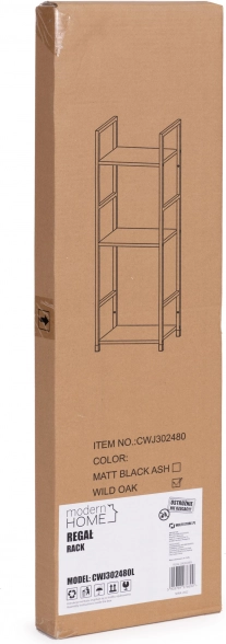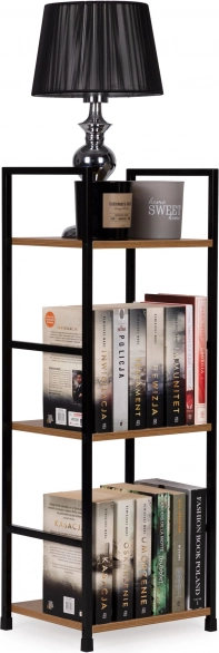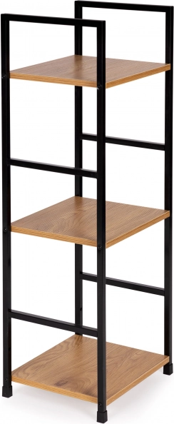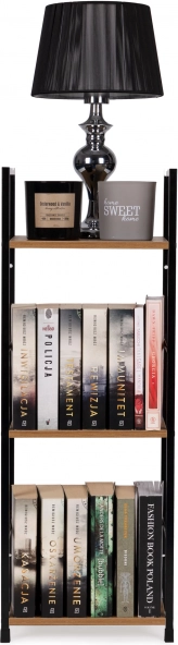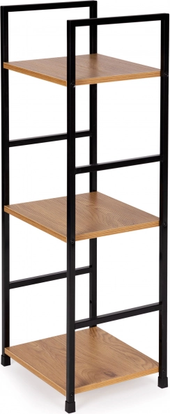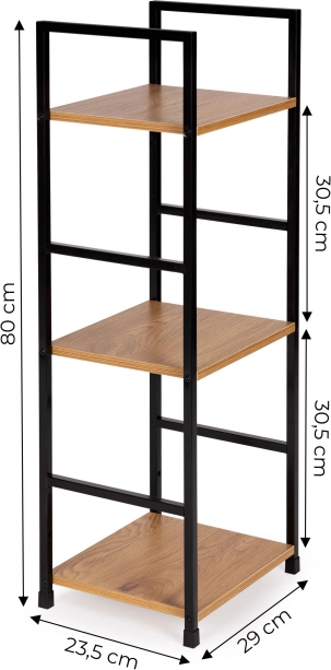 Stílusos, indusztriális könyvespolc fekete fémszerkezettel és fa dekorú MDF polcokkal. 3 praktikus polcot, stabil felépítést és sokoldalú felhasználást kínál nappaliba, hálószobába, előszobába és fürdőszobába. Kompakt méreteinek köszönhetően kisebb terekbe is illik, könnyen szerelhető, és az védőkupakok miatt nem karcolja a padlót.