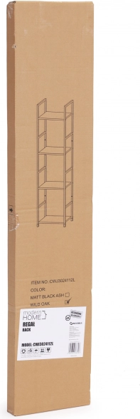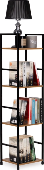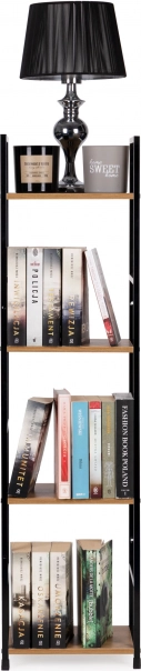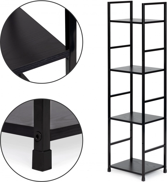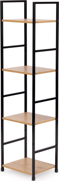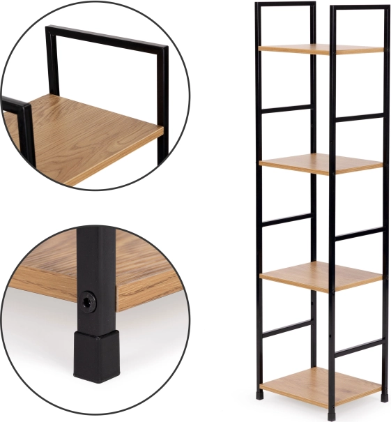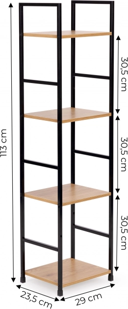Ez a modern, loft stílusú könyvespolc a porszórt fémet és a fa hatású MDF polcokat ötvözi. A 112 cm-es magasság és a kompakt alapterület tökéletes kisebb terekbe, ahol maximálisan kihasználható a hely könyvek, dekorációk, növények vagy fürdőszobai kiegészítők számára. Minden polc mérete 23,5 × 29 cm, a polcok közötti távolság 31 cm, így kényelmesen elfér minden, amit kéznél szeretne tartani.