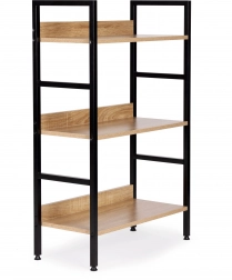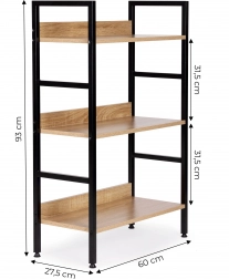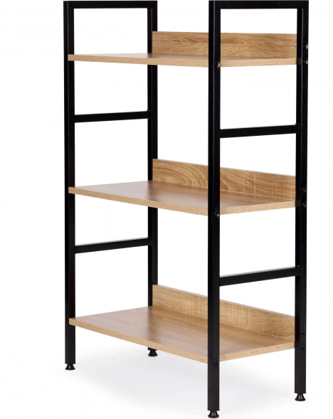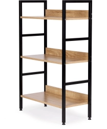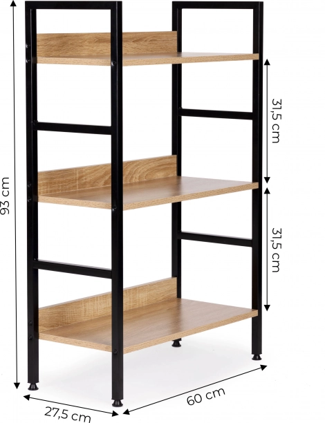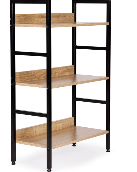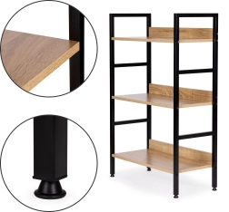 Stílusos, háromszintes loft polc, amely modern dizájnt, stabil fém szerkezetet és univerzális felhasználást kínál nappaliba, hálószobába, előszobába és fürdőszobába. Minőségi faerezet mintázatú MDF polclapok erős, porszórt festésű kereten, állítható, padlóvédő lábak és egyszerű összeszerelés teszik ideális tárolóvá dekorációkhoz, könyvekhez és növényekhez.