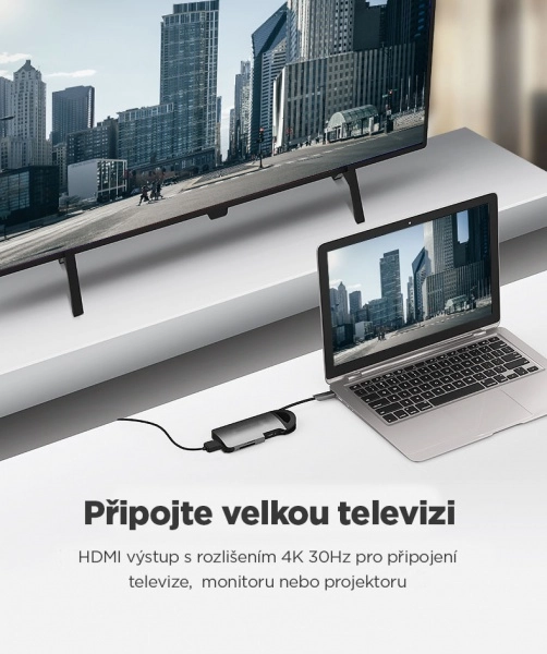 Az Umax U-Connect Type-C Multiport H7 egy kompakt elosztó, amely a laptopja egyetlen USB‑C portját teljes körű csatlakozási központtá alakítja. Kínál 4K @ 30 Hz HDMI kijelzőkimenetet, három gyors USB 3.0 (akár 5 Gb/s) portot, átmenő USB‑C tápellátást, valamint kényelmes SD/microSD kártyaolvasókat a könnyű adatátvitelhez.