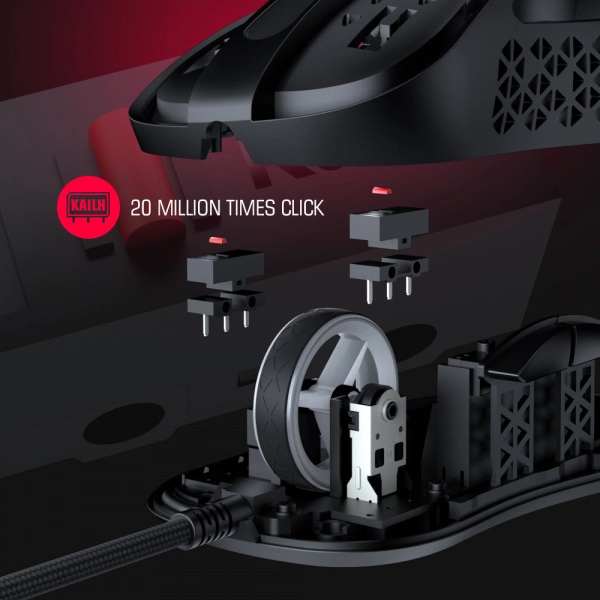 A PMW3360 szenzor pontos mozgáskövetést nyújt akár 12 000 DPI felbontással, így könnyedén válthatsz a gyors suhintások és a finom célzás között. A Kailh mikrokapcsolók éles, megbízható kattintásokat garantálnak hosszú élettartammal. A stílusos görgő „orosz kerék” dizájnja biztos és kényelmes görgetést nyújt. A világítás 3 üzemmódot kínál intenzitás és effektek terén a megjelenés személyre szabásához.