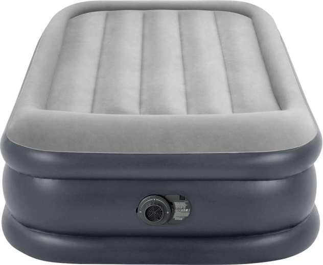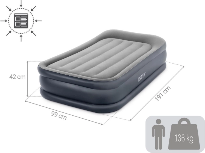 INTEX egyszemélyes felfújható ágy 191 × 99 × 42 cm mérettel, beépített elektromos pumpával a gyors felfújáshoz, selymes velúr felülettel a kényelemért és tartós Fiber‑Tech / Dura‑Beam szerkezettel a stabil tartásért. Maximális teherbírás 136 kg, a csomag tartalma hordtáska és javítófolt.