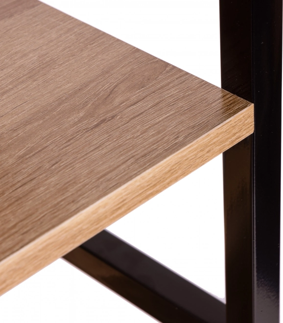 A fekete fém váz és az MDF polcok kombinációja modern megjelenést és megbízható szerkezetet kínál.