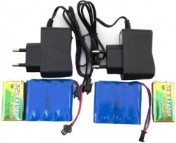 Játssz plusz vásárlások nélkül – a csomag tartalma: 2 db újratölthető akkucsomag, 2 db töltő és 2× 9 V-os elem a távirányítókhoz. Egy töltéssel a menetidő 10–15 perc.