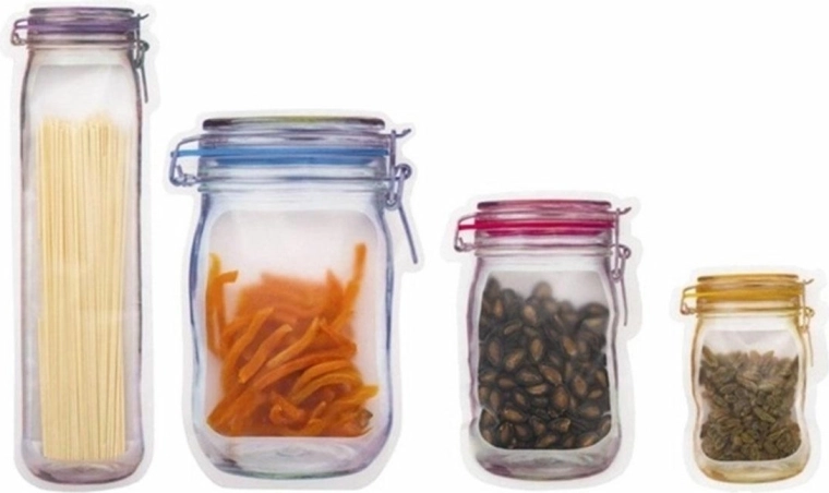 20 darab zsinóros élelmiszertasak készlete az élelmiszerek biztonságos tárolásához. Eredeti, üveget ábrázoló minta. Akár 4 különböző méretben, kisebb és nagyobb adagok csomagolásához.