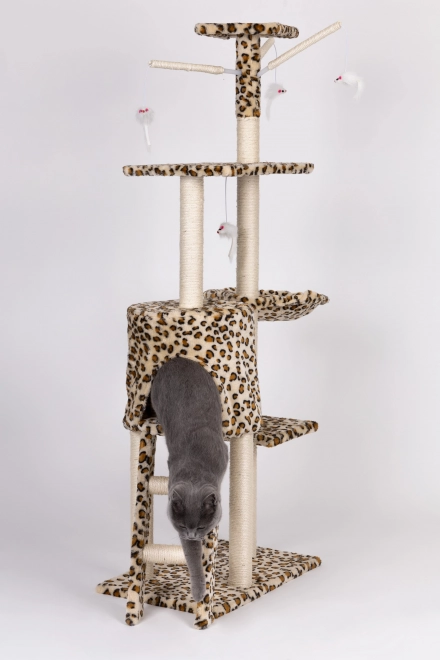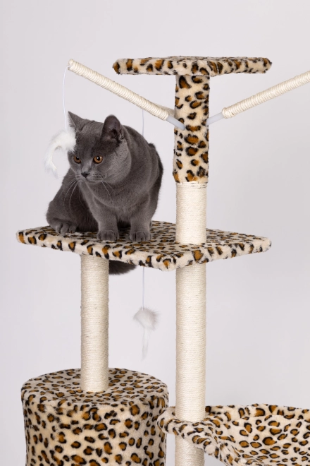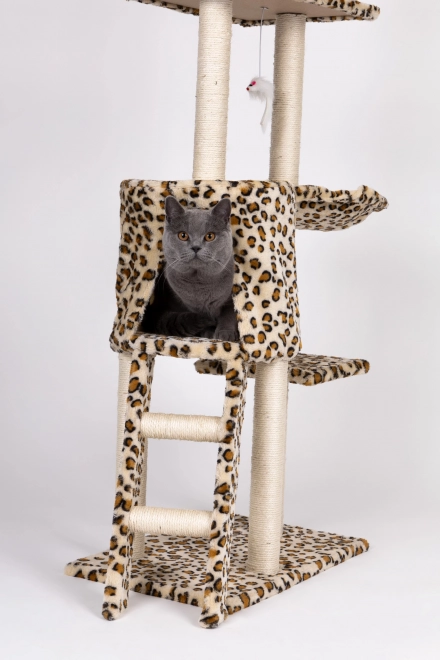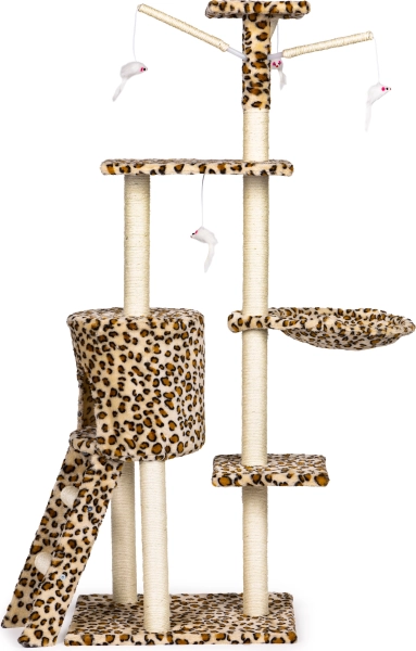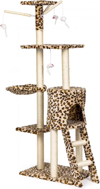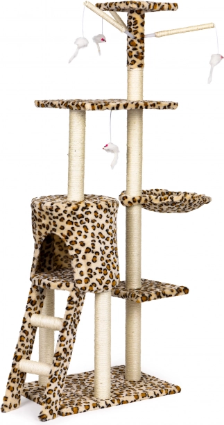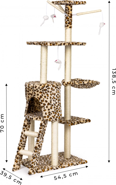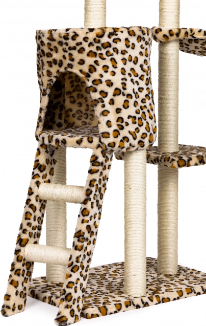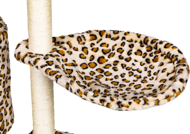 Teremtsen cicájának biztonságos menedéket pihenéshez, kaparáshoz és játékhoz. Ez a magas, leopárdmintás macskafa masszív MDF alapzaton áll, és szizállal betekert oszlopokkal rendelkezik, amelyek támogatják a természetes kaparást, miközben megóvják a bútorokat. A legmagasabb kilátó sem hiányzik, ahonnan a cica belátja a teljes teret.