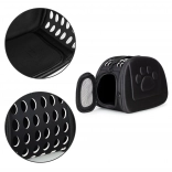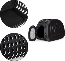 A hordozó rendelkezik ergonomikus fogantyúval és levehető állítható pánttal, amelyek megkönnyítik a hordozást. A két oldalas nyithatóság lehetővé teszi a könnyű hozzáférést a kedvencéhez és a hordozó tisztításához. A szellőzőnyílások biztosítják a megfelelő levegőellátást és kényelmet a szállítás során.