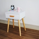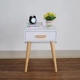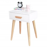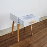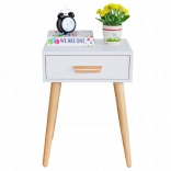 Elegáns éjjeliszekrény/lerakóasztal modern skandináv stílusban, fehér lappal és természetes fenyő lábakkal. Praktikus fiókkal fa fogantyúval, stabil felépítéssel és kompakt méretekkel, ideális hálószobába és nappaliba. A tartós laminált lap könnyen tisztítható és hosszú élettartamot biztosít az asztalnak.