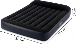 Az INTEX bársonyos matraca 191 x 137 x 25 cm méretben ideális 2 fő számára. Tartós PVC anyagból készült, a felső rész vízálló, kellemes tapintású bársonyos anyaggal bevont. A kellemes sötétkék szín bármely enteriőrhöz illik. A beépített elektromos pumpának köszönhetően (220–240 V táplálás) a matrac használatra készre fújása 250 másodpercet vesz igénybe. A bostoni szeleppel egy percen belül leereszthető, összehajtható és a szekrénybe tehető.