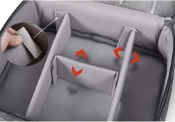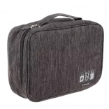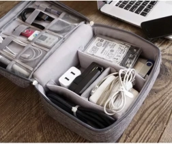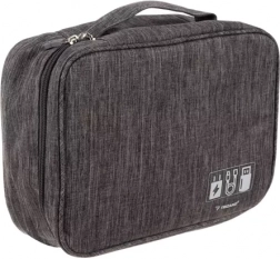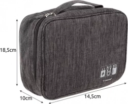 A szervező fő része állítható és elválasztott rekeszeket tartalmaz különféle kábelekhez, töltőkhöz és más kiegészítőkhöz. A hálós és gumírozott rekeszek biztosítják, hogy minden a helyén maradjon. A fogantyúval a könnyű szállítás érdekében ideális társ az utazások, az irodai használat, vagy találkozók során.