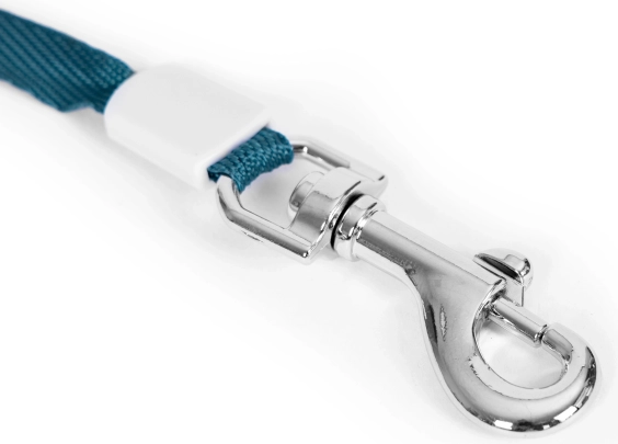 A masszív fémcsat szabadon forog, és megakadályozza a szalag megcsavarodását. Biztonságos és gyors rögzítés nyakörvhöz vagy hámhoz.