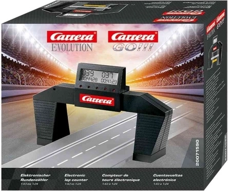Fejlessze CARRERA autópályáját az elektronikus körszámlálóval a GO és EVOLUTION sorozatokhoz. A készülék a fénygát révén megbízhatóan rögzíti minden áthaladást, lehetővé teszi a pontos körszámra vagy meghatározott időre állított versenyt, és részletes időket ad 1/100 másodperces pontossággal.