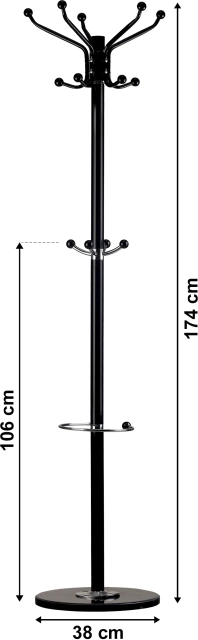 A felső részen öt kar található, amelyekre két kabát is felakasztható. Félmagasságban további akasztók vannak, kalapok, esernyők vagy táskák számára.