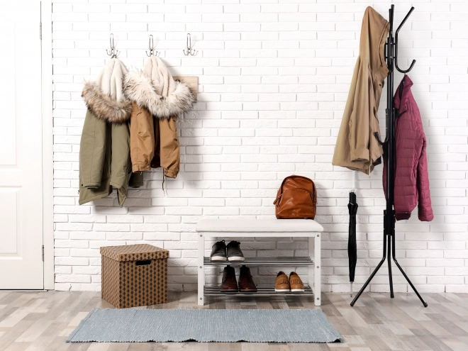 Nyolc felső akasztó kabátokhoz és dzsekikhez, valamint három alacsonyabb akasztó, melyek ideálisak gyerekeknek, kalapoknak vagy esernyőknek.