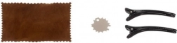 - olló és fésű: rozsdamentes acél; markolatok és egyéb: ABS; 2 csat: műgyanta; tisztítókendő: poliészter; tok: ökobőr