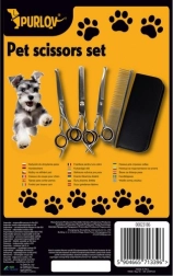 A lekerekített hegyek védik az érzékeny területeket a szem, a fül és a mancs környékén. A háromféle olló lehetővé teszi a pontos formázást és a ritkítást: az egyenes univerzális vágásokhoz, a ritkító az elvékonyításhoz és a finom átmenetekhez, az ívelt pedig a nehezen hozzáférhető helyeken történő biztonságos munkához. Mindet zárható tokba teheti, így az eszközök mindig kéznél és biztonságban vannak.