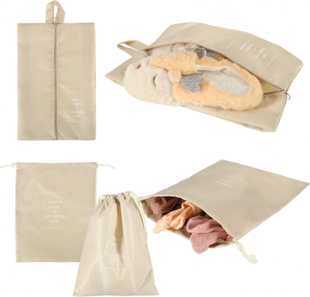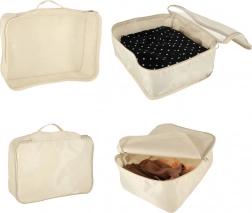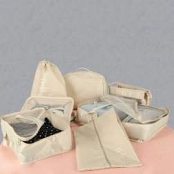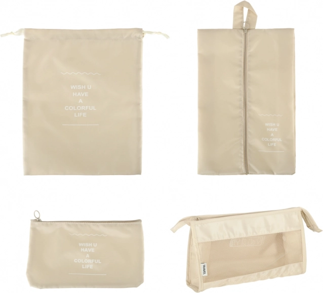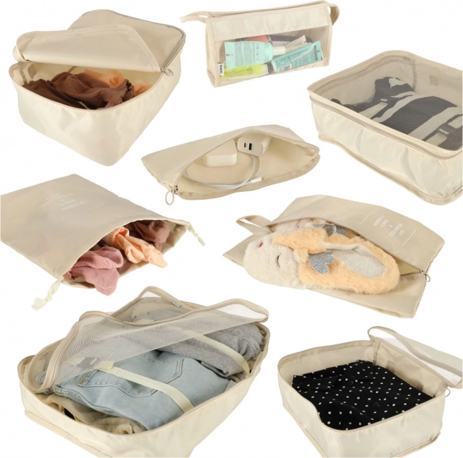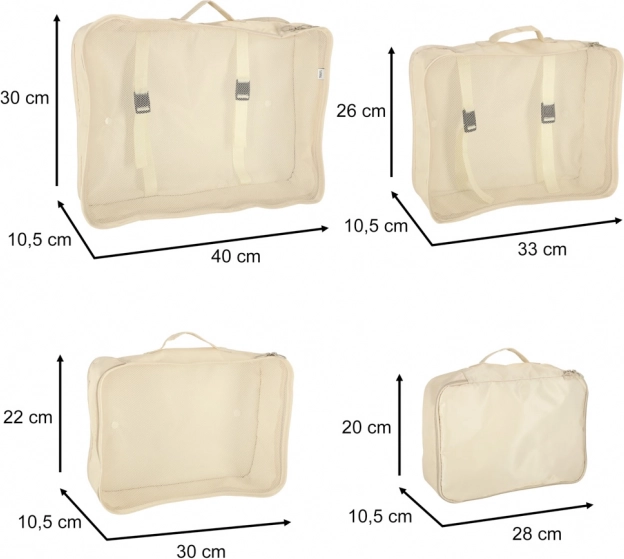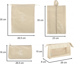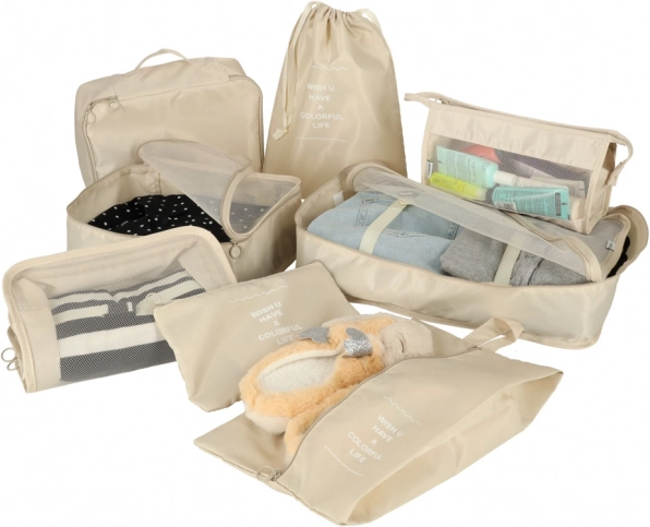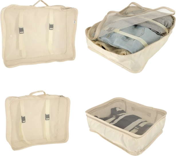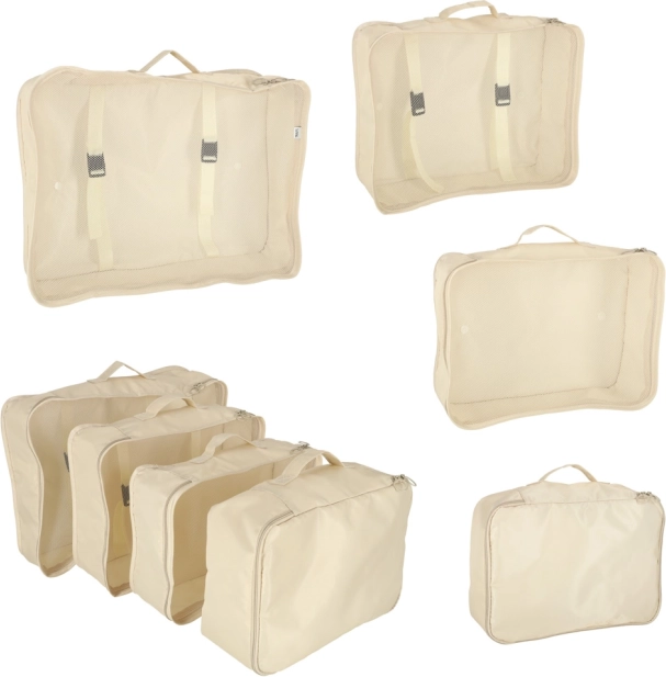Tegyen rendet a poggyászában egyszer s mindenkorra. Ez az elegáns, bézs színű, 8 darabos utazási rendező szett négy ruharendező kockát, egy cipőtasakot, egy kozmetikai neszesszert, egy összehúzható zsákot és egy kis zsebet tartalmaz apróságoknak. A könnyű és tartós poliészter textilnek köszönhetően a rendezők könnyen tisztíthatók, szennyeződésállók, és tökéletesek az áttekinthető csomagoláshoz utazáshoz és mindennapi használatra is.