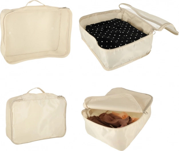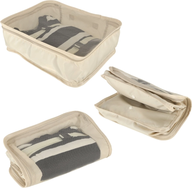 A különböző méretű kockák és zsákok lehetővé teszik, hogy a ruhákat, fehérneműt, kiegészítőket és kozmetikumokat logikusan szétválassza, így minden kéznél van és első pillantásra látható.