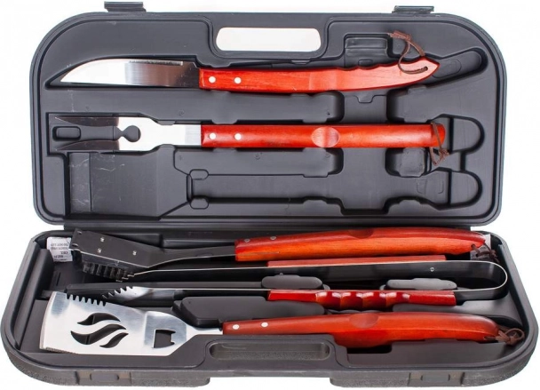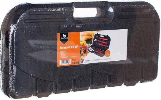 A készlet 5 darabból áll: 48 cm hosszú drótkeféből, bordázott grillfogóból 45 cm hosszban, 48 cm hosszú széles spatulából, éles szeletelő késből 45 cm hosszú pengével, valamint kétágú villából 46 cm hosszban. A teljes készlet mindössze 2,08 kg.