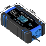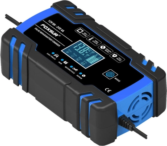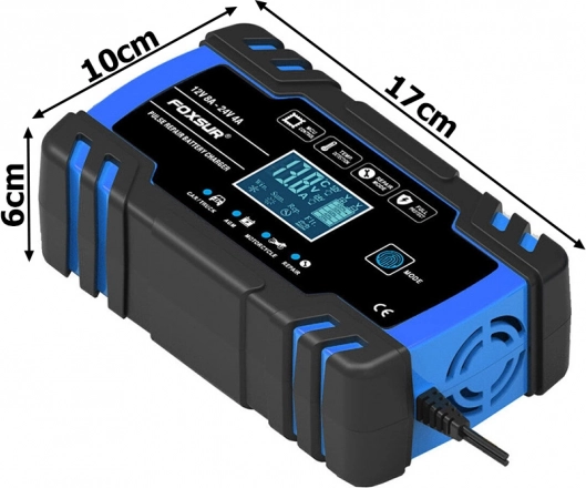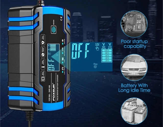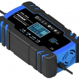 Kompakt és intelligens töltő 12V/24V autóakkumulátorokhoz digitális kijelzővel és javító móddal. Biztosít gyors és biztonságos töltést, kínál téli és nyári módot, automatikus védelmet és pulzáló regenerálást a legyengült akkumulátorok újjáélesztéséhez. Ideális autókhoz, motorkerékpárokhoz és más járműakkumulátorokhoz.